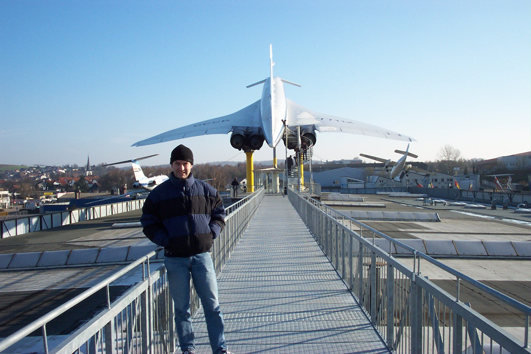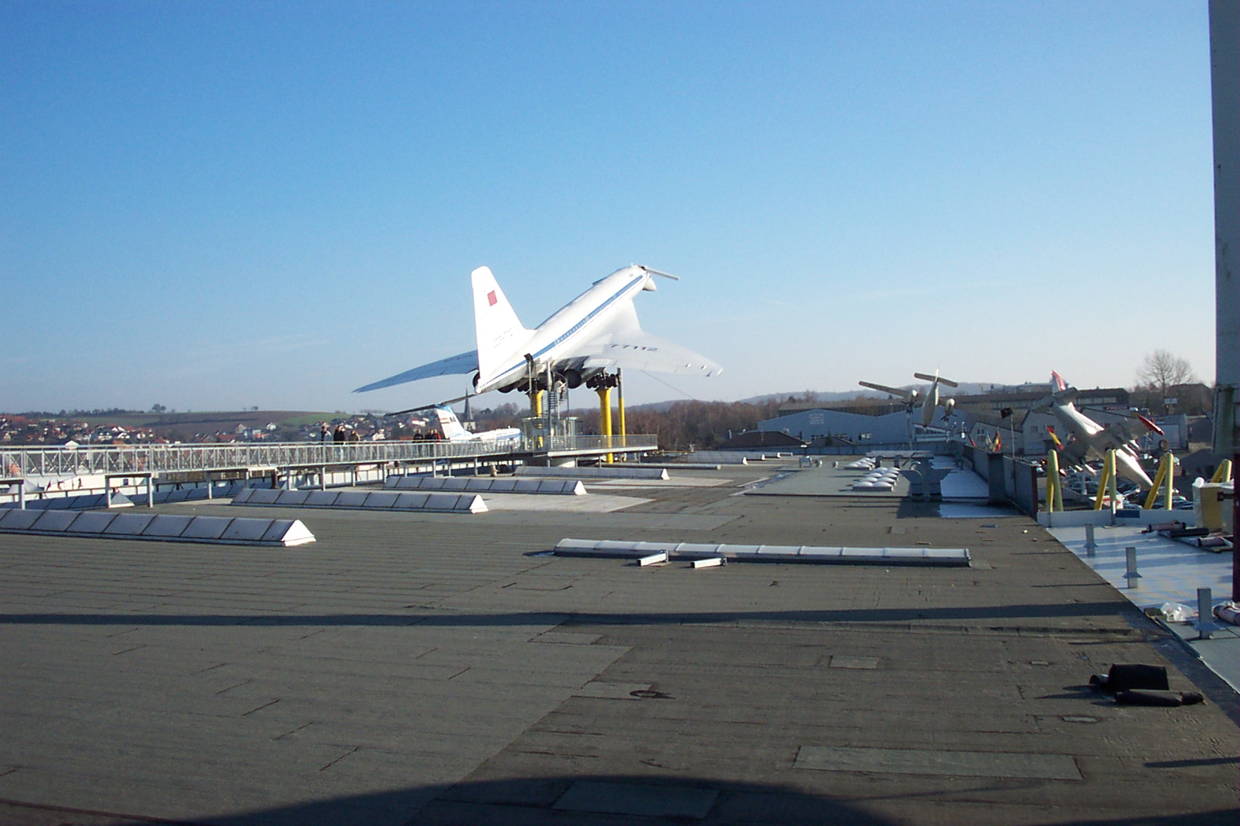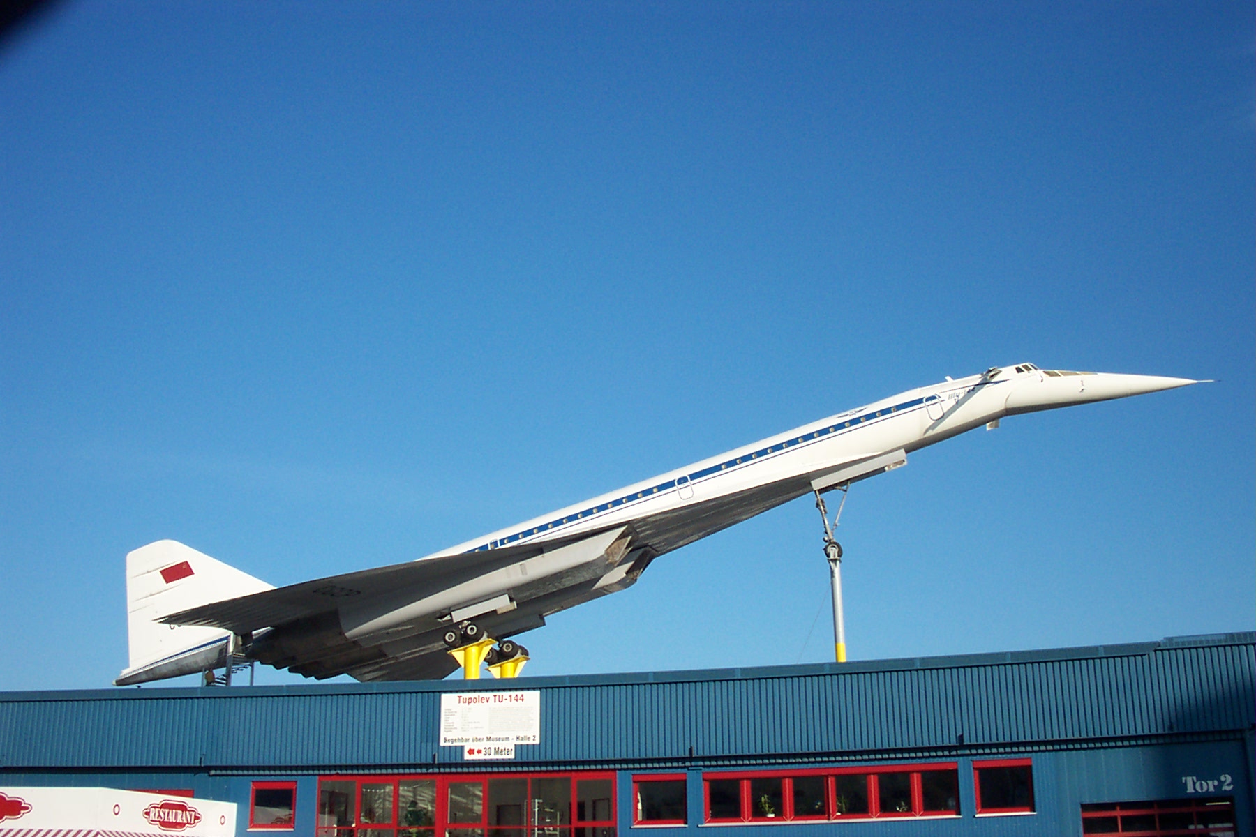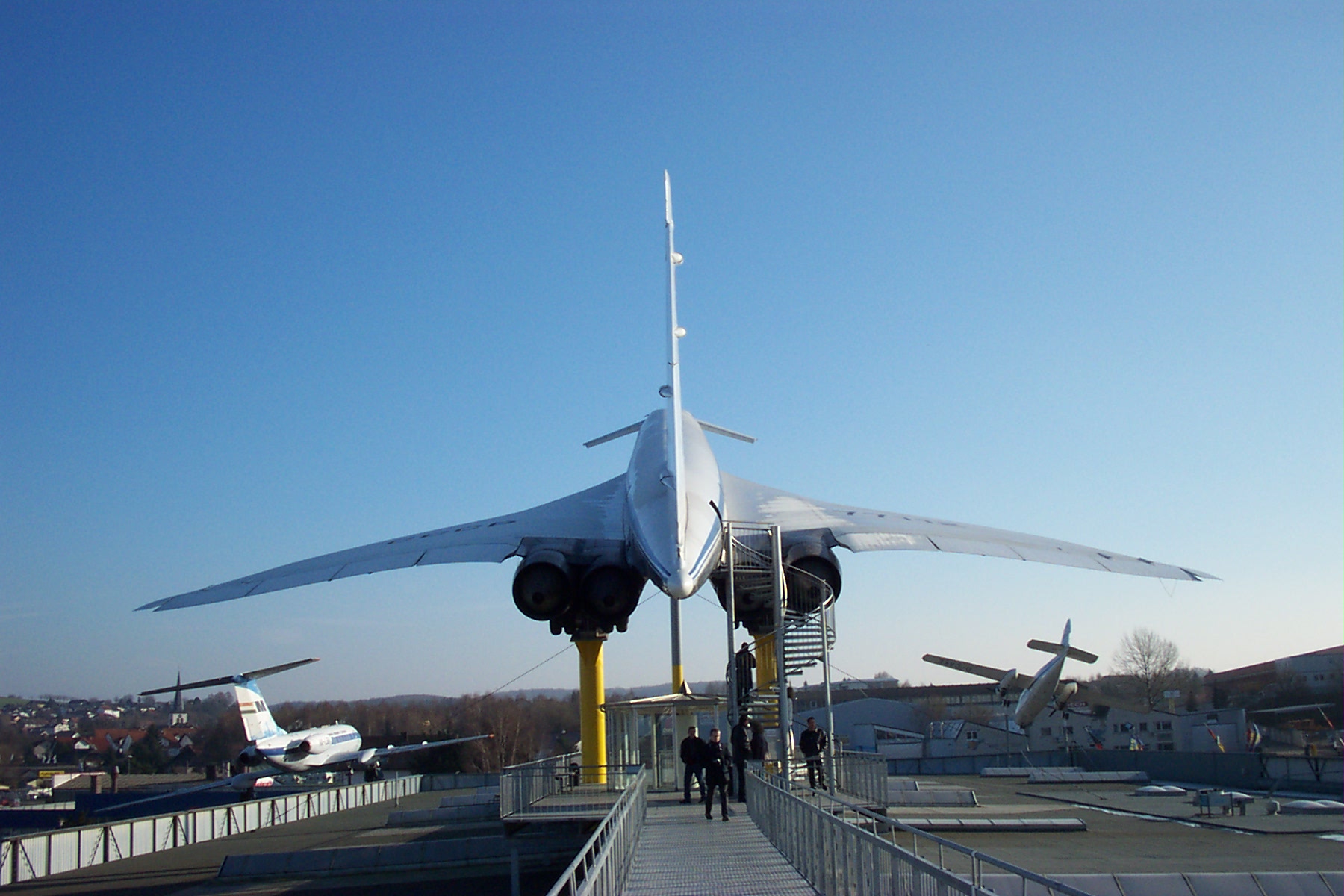 The Technikmuseum in Sinsheim, southwest Germany, has a very varied collection of aeroplanes and cars on display. One of the highlights of their collection is the Tupolev Tu-144 which is brilliantly situated above one of the exhibition halls and clearly visible from the nearby Nuernburg to Saarbruecken A6 Autobahn. The plane is mounted by it's landing gear on stilts high above the roof which combined with the plane's size is really impressive. Visitors to the museum with a good head for heights are able to enter the Tupolev via steps which enter through the rear door on the right side.